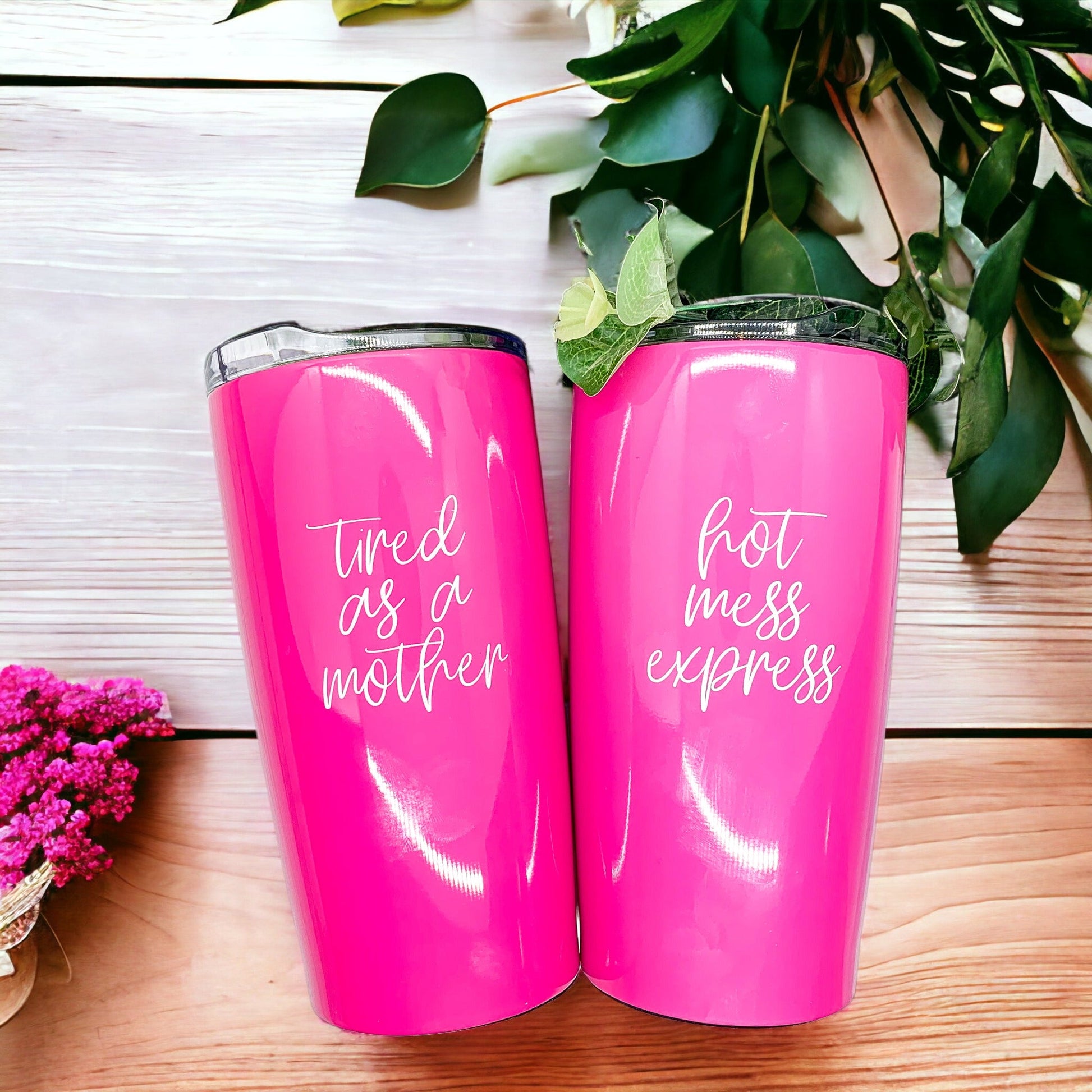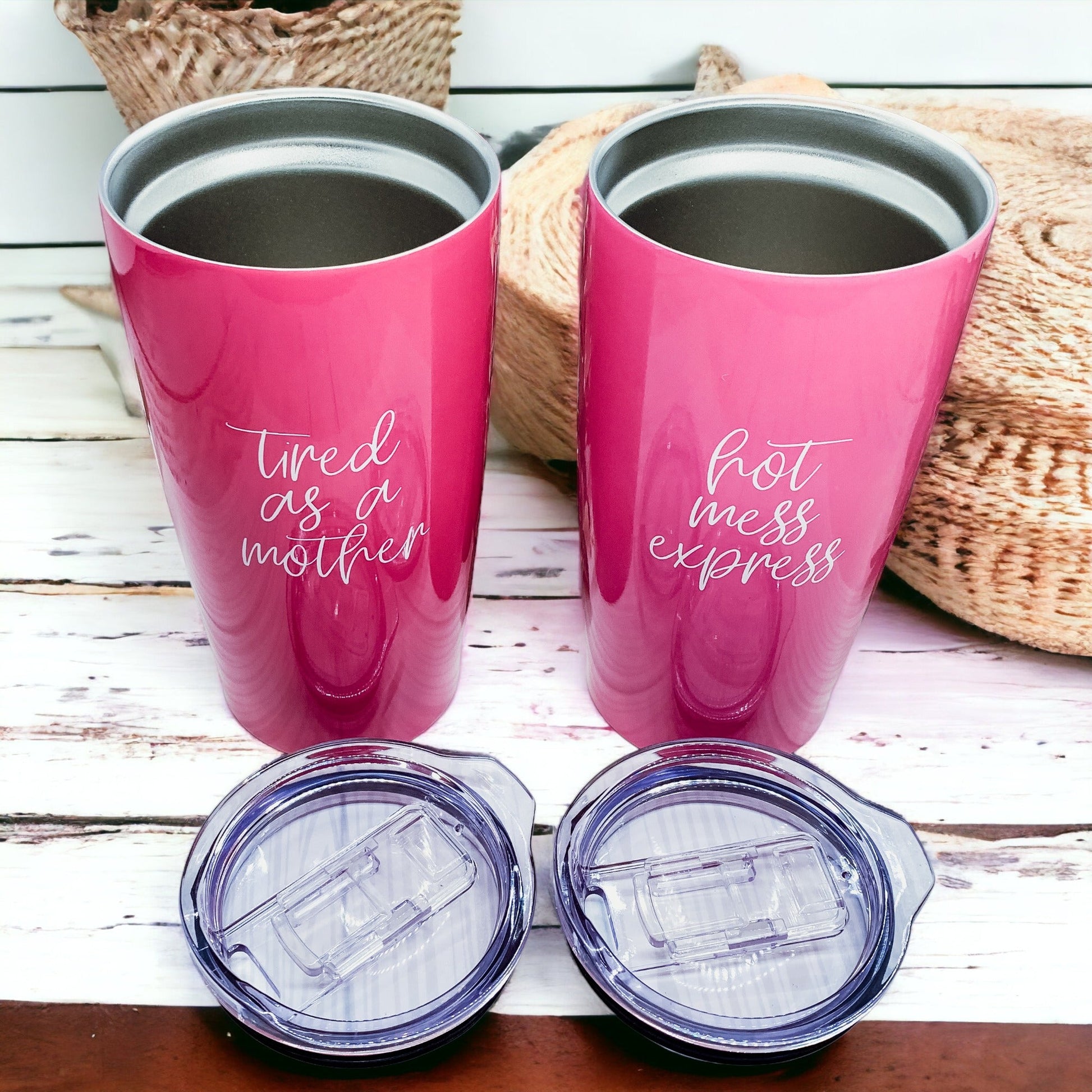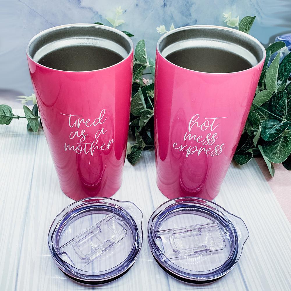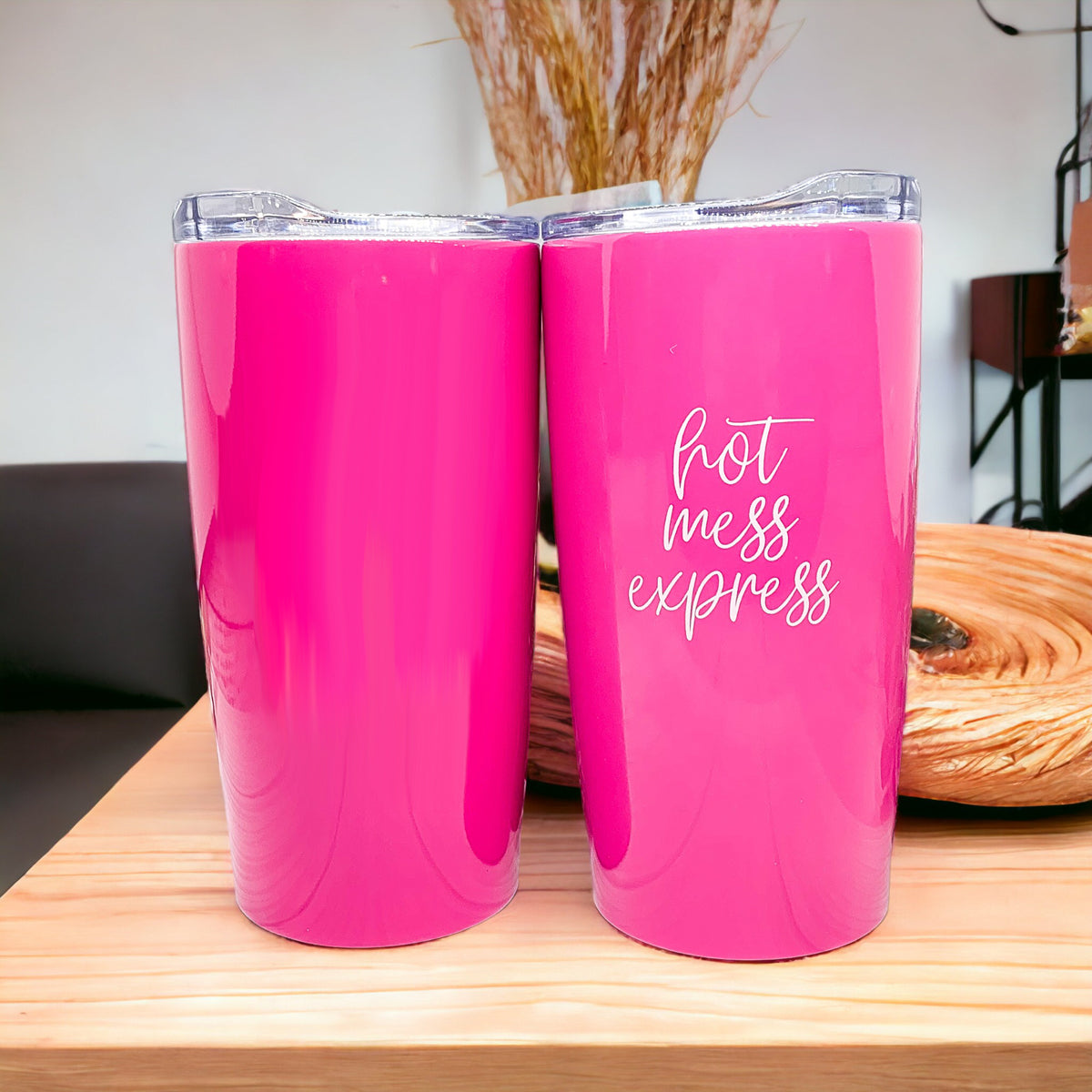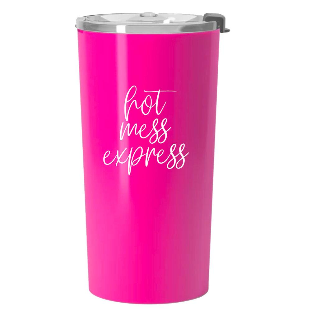 Our infamous Hot Mess Express Drinkware now put on a Pink Travel Mug! Whether it's your daily motto or a funny gift for a loved one, this is a must have for all! As we all have our hot mess express days, some just have them more often than others ;)