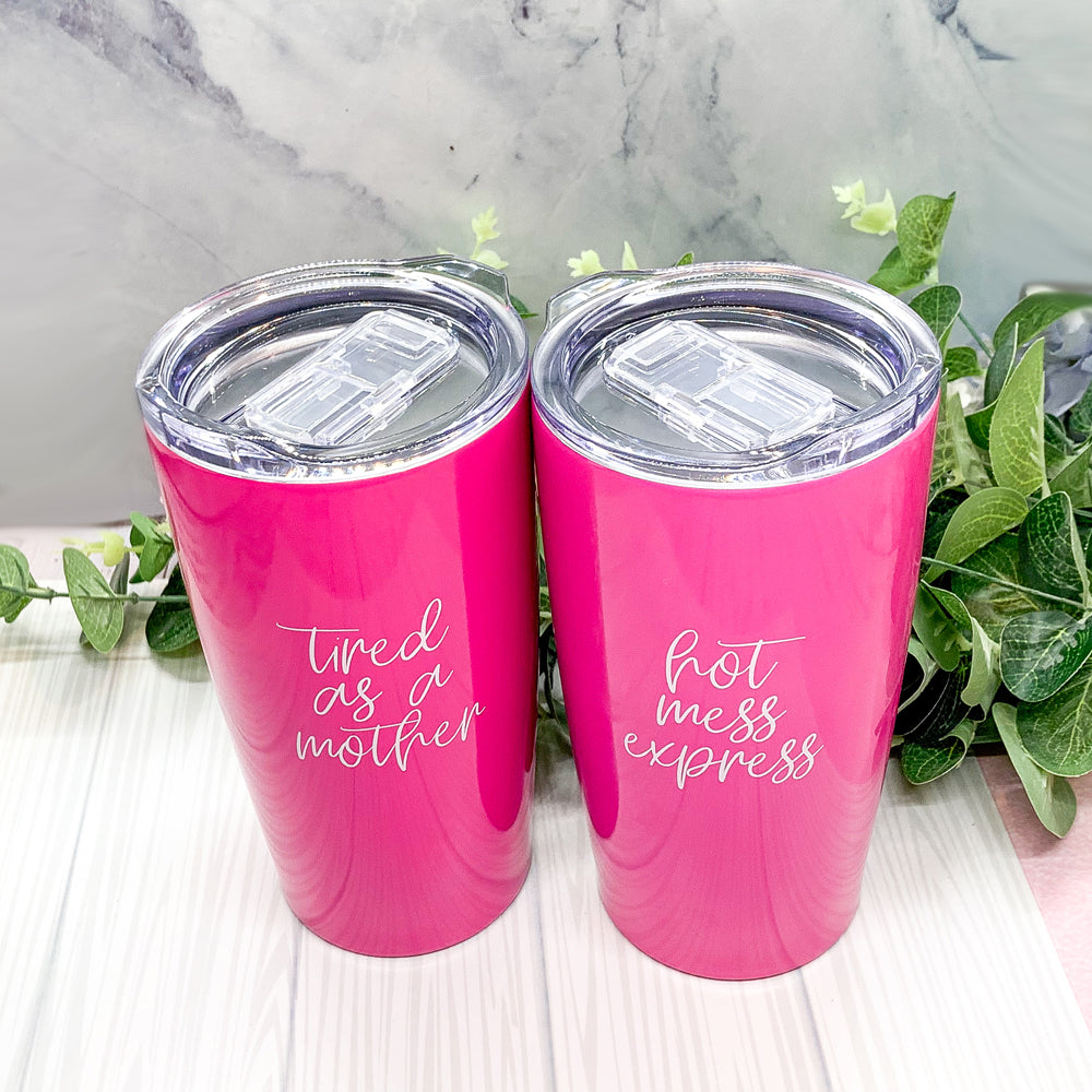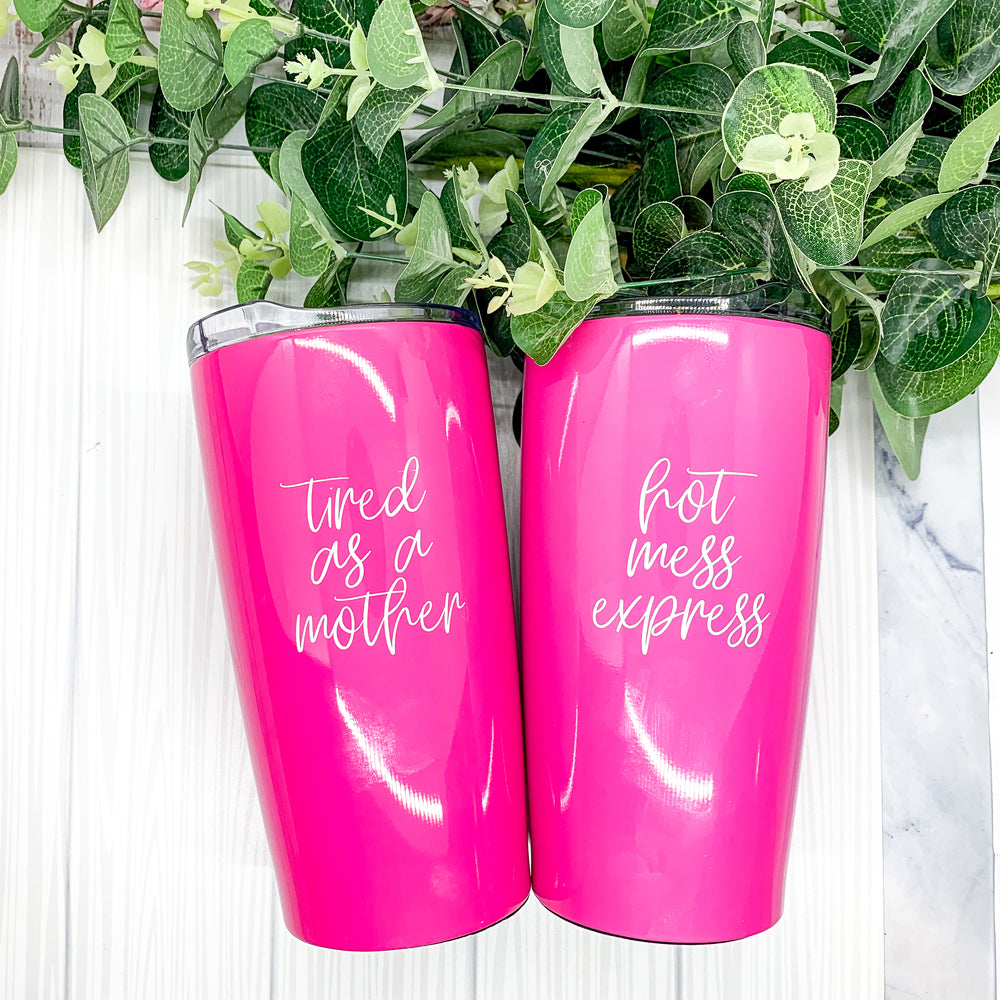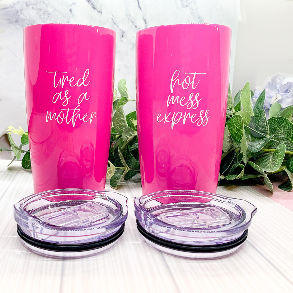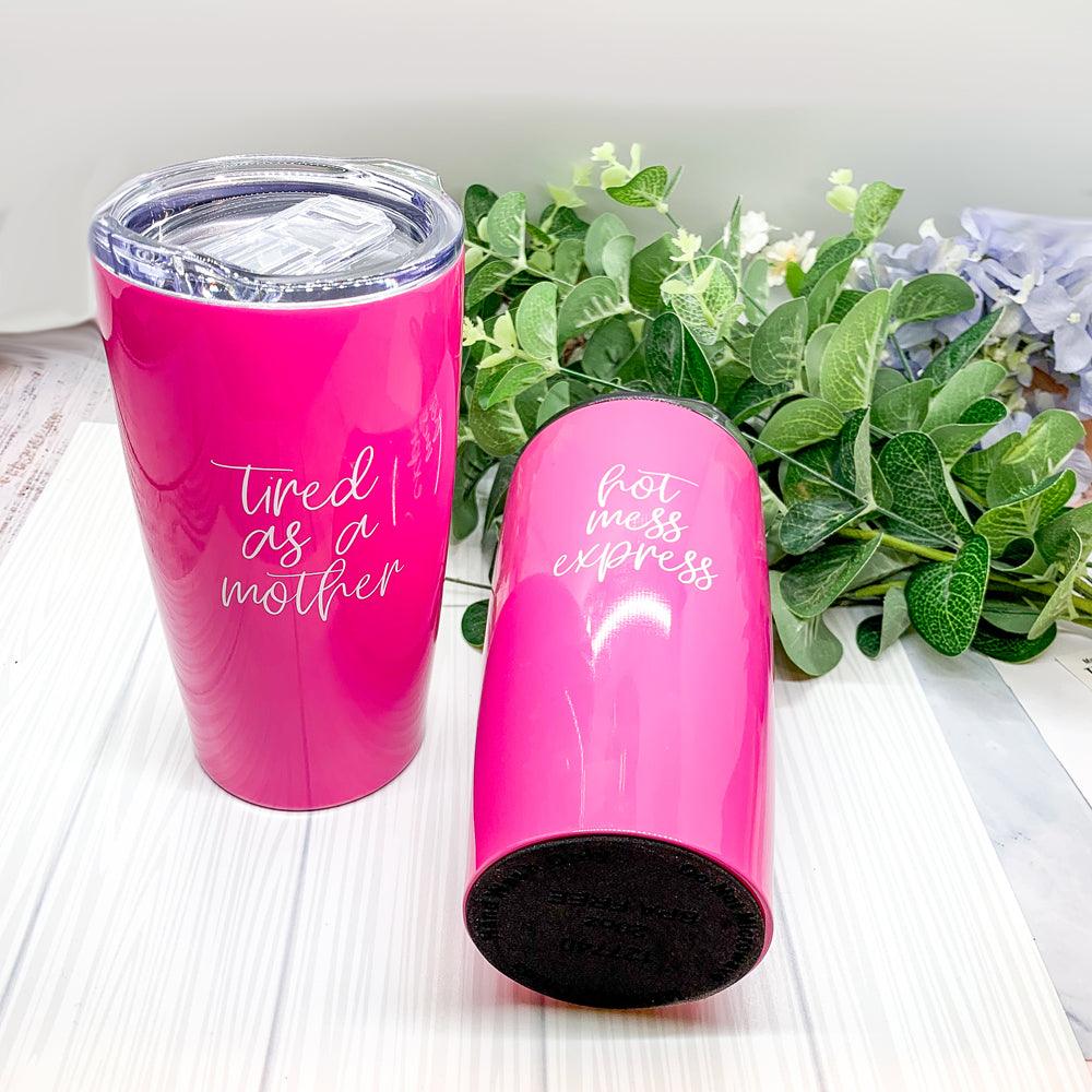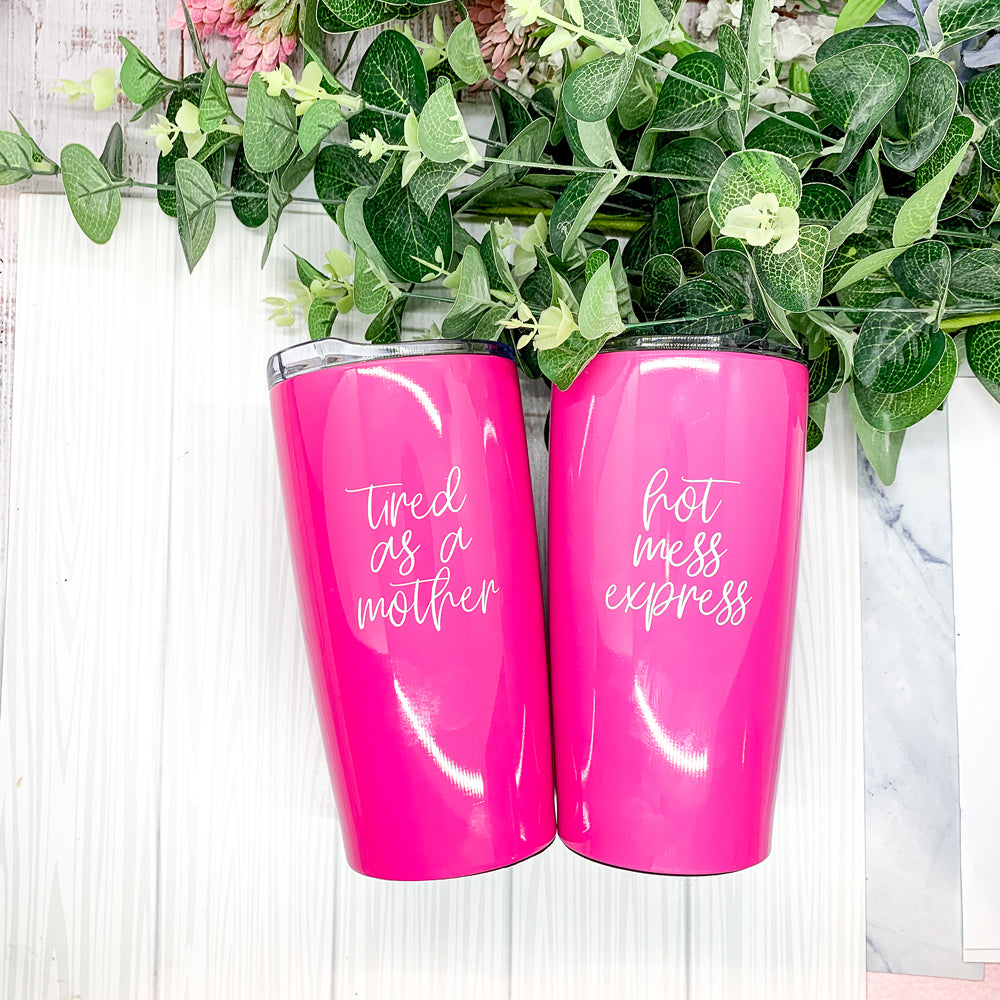 Our infamous Hot Mess Express Drinkware now put on a Pink Travel Mug! Whether it's your daily motto or a funny gift for a loved one, this is a must have for all! As we all have our hot mess express days, some just have them more often than others ;)