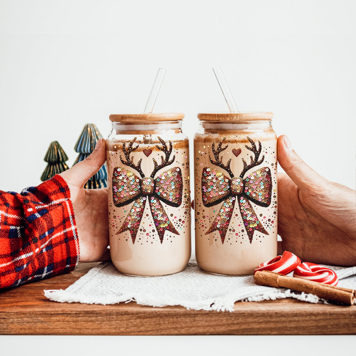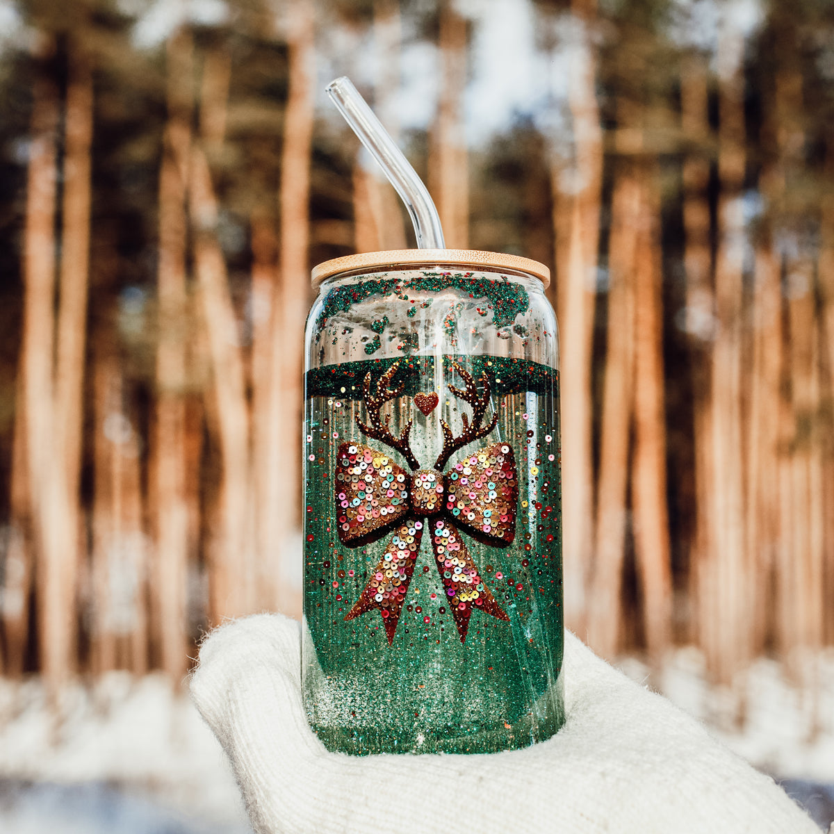 Sequin Bow Reindeer Glass Tumbler - 17oz of Pure Holiday Glam